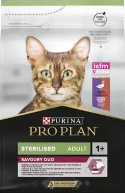 פורינה פרו פלאן Savoury Duo מזון יבש לחתולים לאחר סירוס\עיקור בטעם ברווז וכבד הוא מזון מלא ומאוזן המותאם לצרכים הייחודיים של חתולכם. בזכות שילוב ייחודי של רכיבים איכותיים ותכולת חלבון גבוהה, המזון מציע חוויית טעם עשירה שגם החתול הבררן ביותר יתקשה לעמוד בפניה. הנוסחה המאוזנת של חלבונים, פחמימות ושומנים מסייעת בשמירה על משקל גוף בריא, בעוד  חומצות אמינו חיוניות, חומצות שומן ונוגדי חמצון תומכים בתפקוד תקין של הכליות. בנוסף, הנוסחה המיוחדת מפחיתה את הסיכון להיווצרות אבנים בדרכי השתן – בעיה נפוצה בקרב חתולים מעוקרים/מסורסים.