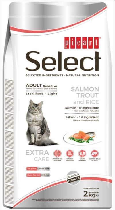 Select. מזון יבש, מלא לחתולים מסורסים. תוצרת ספרד. סנסיטיב סלמון אריזות: 8 ק"ג